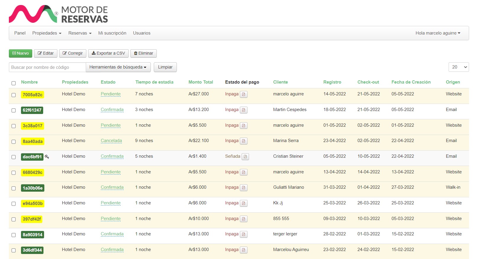 Listado de Reservas